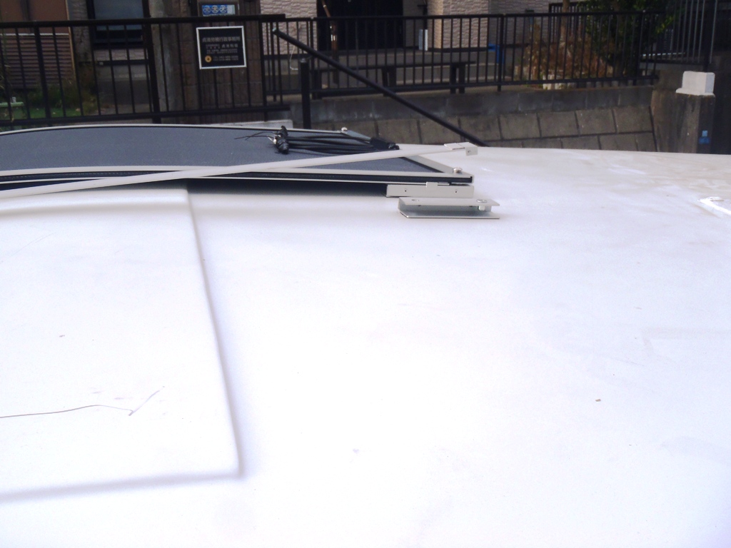 そのまま屋根に貼り付けている人もいますが、ソーラーパネルは熱を持つので、隙間を空けたほうが良いとのこと。なので、浮かしてつけることにします。